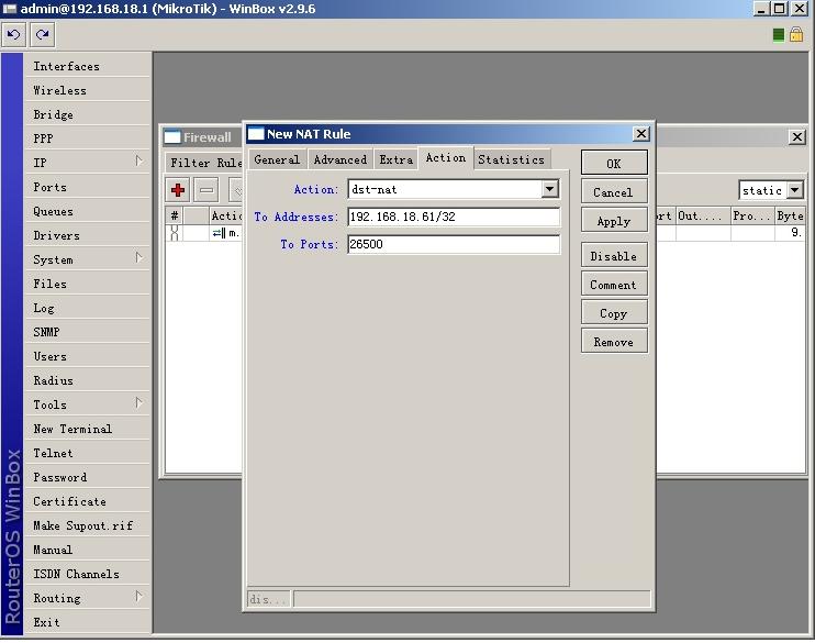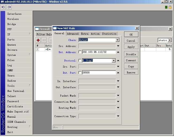 在下面的例子中,MZDBT运行在IP为192.168.18.61的内网中,使用的端口为26500。代理服务器的内网IP为192.168.18.1,外网IP为202.103.96.112。下面的任务是将端口26500映射到公网上去。启动Winbox,选择IP--Firewall--NAT选项,点击加号,添加一条规则: