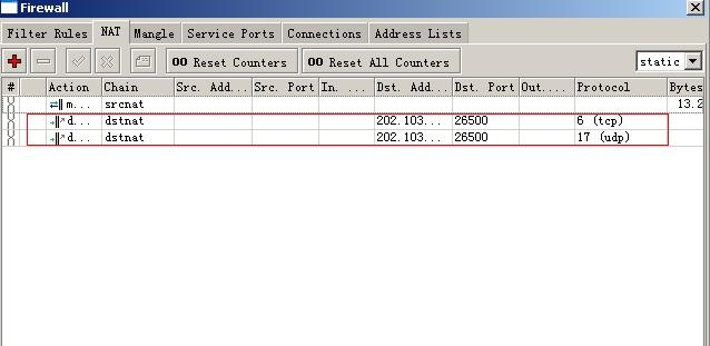 在Action选项中选择dst-nat目的地址转换,To Addresses中填入MZDBT所在机器的内网IP,To Ports填写26500,然后点击OK保存按照同样的办法,再映射UDP端口,区别在于选择Protocol时请选择17号协议即UDP协议。完成之后如下图所示: