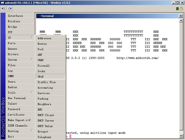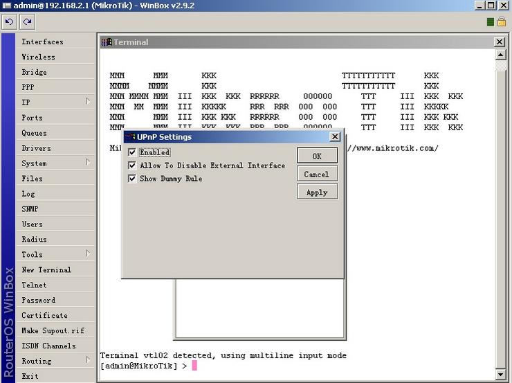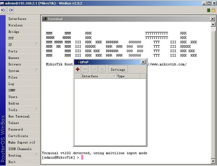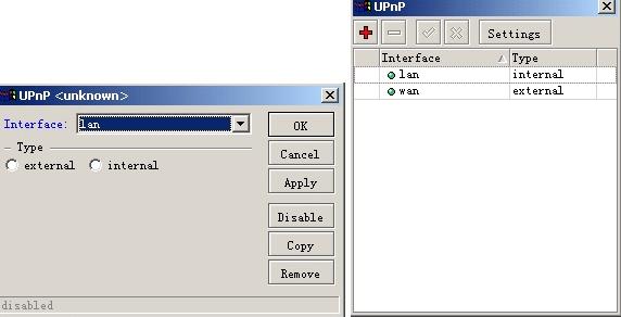 下面以RouterOS2.9.2为例说明。用WinBox登陆之后点击IP—uPNP: